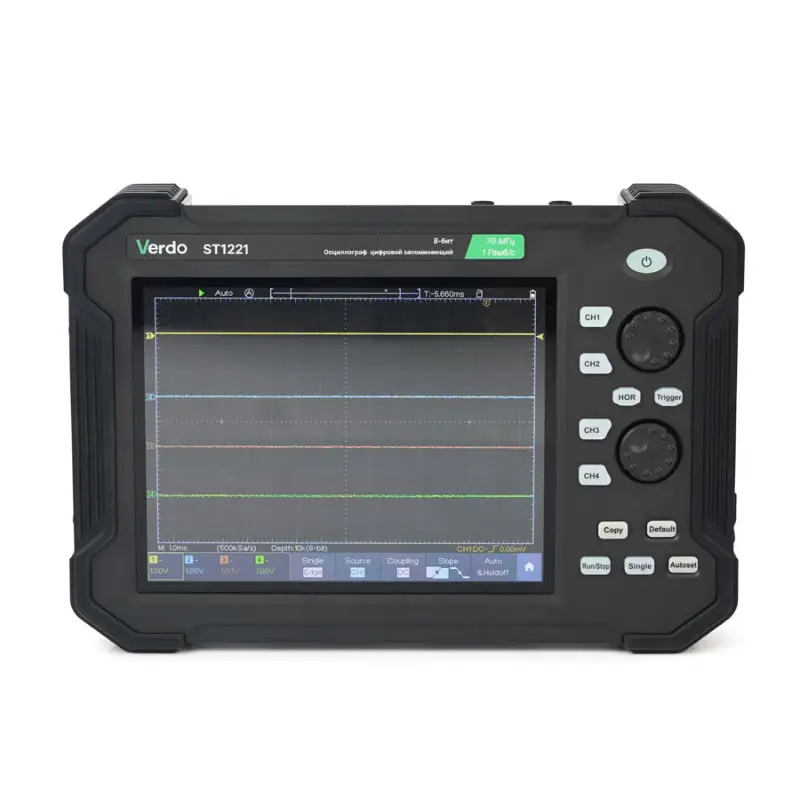 Осциллограф VERDO ST1221 представляет собой современный планшетный прибор, сочетающий высокую производительность с удобством использования. Благодаря компактному форм-фактору и 8-дюймовому дисплею он обеспечивает комфортную работу как в лабораторных условиях, так и в полевых. Прибор внесен в ГосРеестр СИ под номером 90665-23, что подтверждает его соответствие российским стандартам точности и надежности.