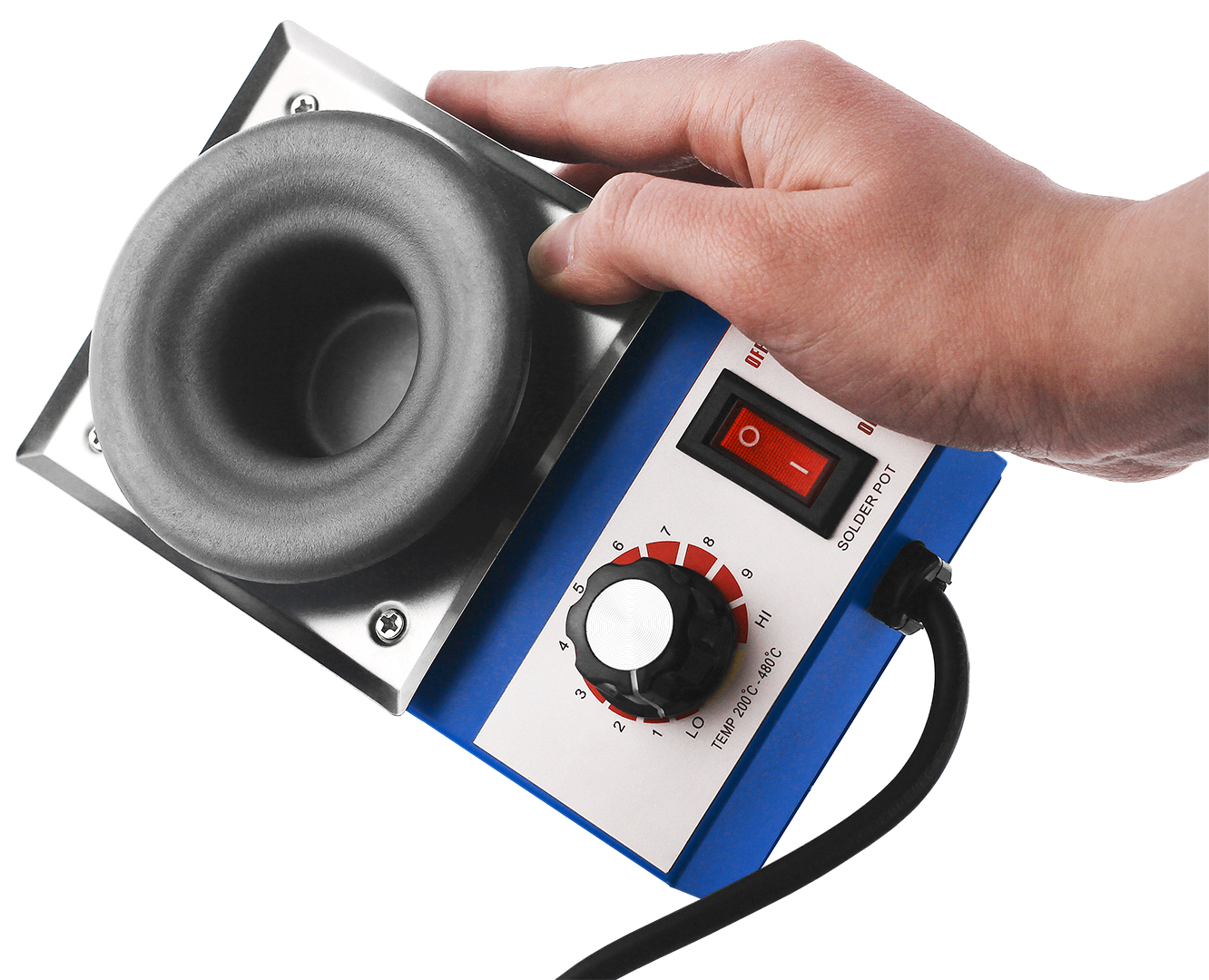 МЕГЕОН 02826 — паяльная ванна предназначена для плавления припоя и последующего поддержания температуры в период выполнения работ. Применение изделия для группового лужения проводников радиокомпонентов перед пайкой значительно увеличит качество пайки и снизит вероятность перегрева. Ванна также может использоваться для групповой пайки и лужения проводов, кабельных наконечников и других изделий методом погружения в расплав. Изделие также может применяться для плавления различных низкотемпературных сплавов. Тигель из коррозионностойкого материала с нанесенным на него коррозионностойким покрытием и металлический корпус значительно увеличат срок службы изделия. Металлический экран по периметру тигля исключит попадание припоя внутрь прибора. Небольшие габариты и масса ванны позволят размещать изделие на любых рабочих местах.