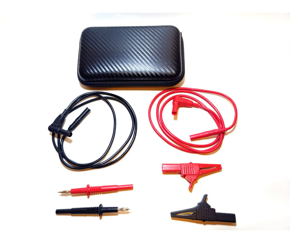 В комплект входят надёжные соединительные провода с угловыми штекерами типа «банан», рассчитанные на напряжение до 1000 В и ток до 10 ампер, что обеспечивает безопасную работу в системах категории CAT III. Также предусмотрены зажимы типа «крокодил» и щупы красного и чёрного цвета, рассчитанные на такие же показатели в категории CAT II. Все компоненты обеспечивают прочное соединение с приборами и объектами измерений, устойчивы к износу и пригодны для регулярного профессионального использования.
